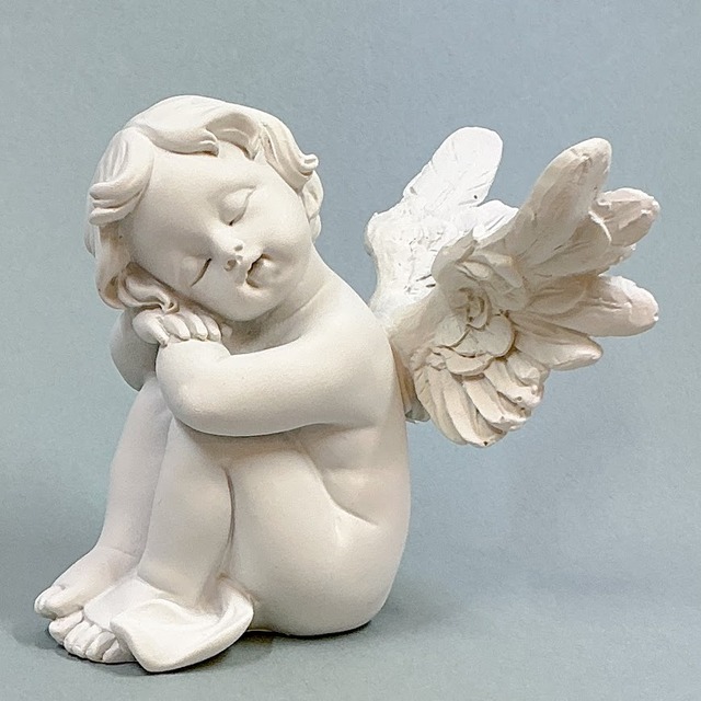 居眠りしている天使の置物です。 背中の羽根や表情などとても繊細で 愛らしい姿に癒されます。 サイズ:高さ 7.8㎝ 幅 7.3㎝(羽根から羽根 重さ:143g