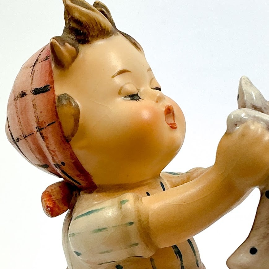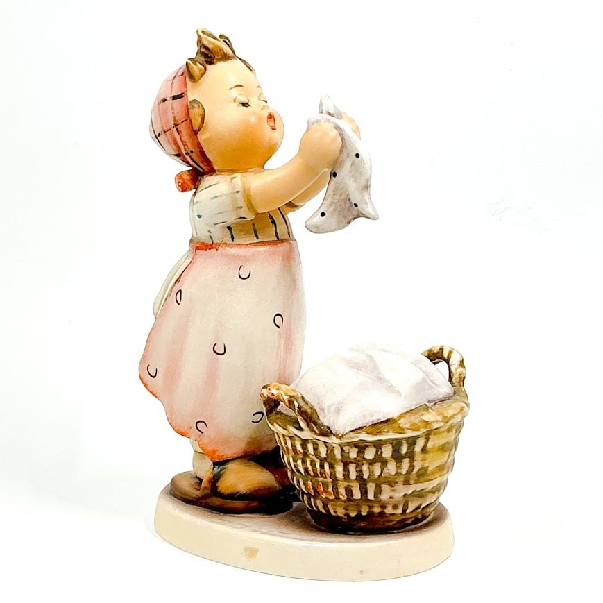 手作りの温かみを感じるフンメル人形は、特にその表情が魅力的で、まるで日常の一瞬を切り取ったかのようです。洗濯を手伝う女の子の姿は、家族の温もりや日々の暮らしを思い起こさせます。その独特のデザインと色使いは、フンメル人形の中でも特別な存在感を放っています。