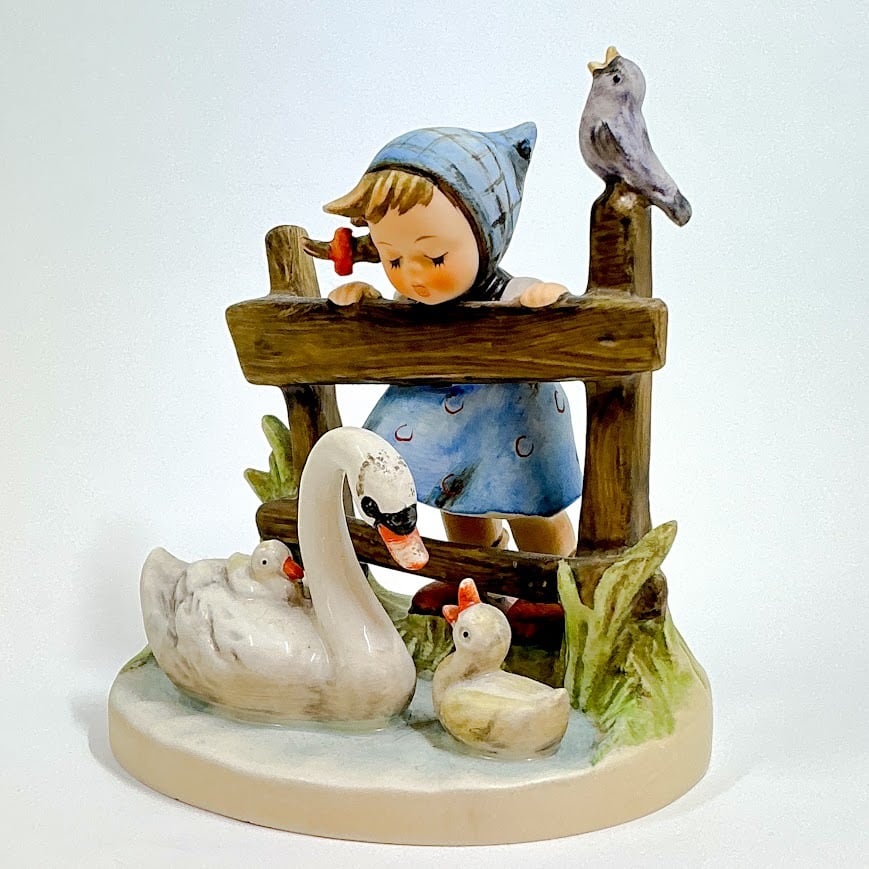 手作りの温かみを感じるフンメル人形は、その表情に特に引き込まれます。白鳥と遊ぶ女の子の姿は、無邪気さと夢の世界を感じさせ、日常に潤いを与えてくれます。その独自のデザインと優しい色合いは、フンメル人形の中でも格別な存在感を放っています。