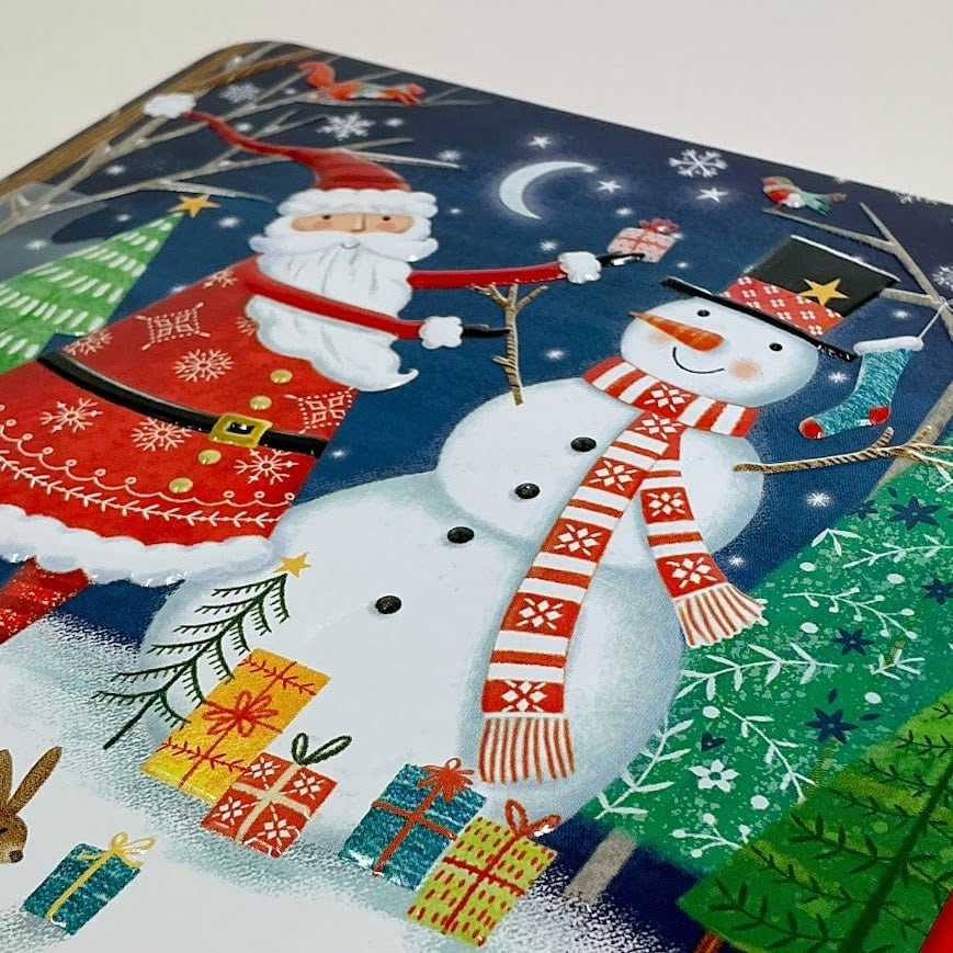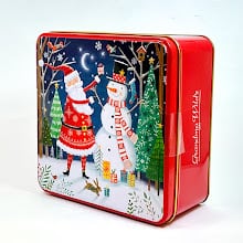 サンタとスノーマンの楽しいクリスマスのひと時を描いたクッキー缶です。