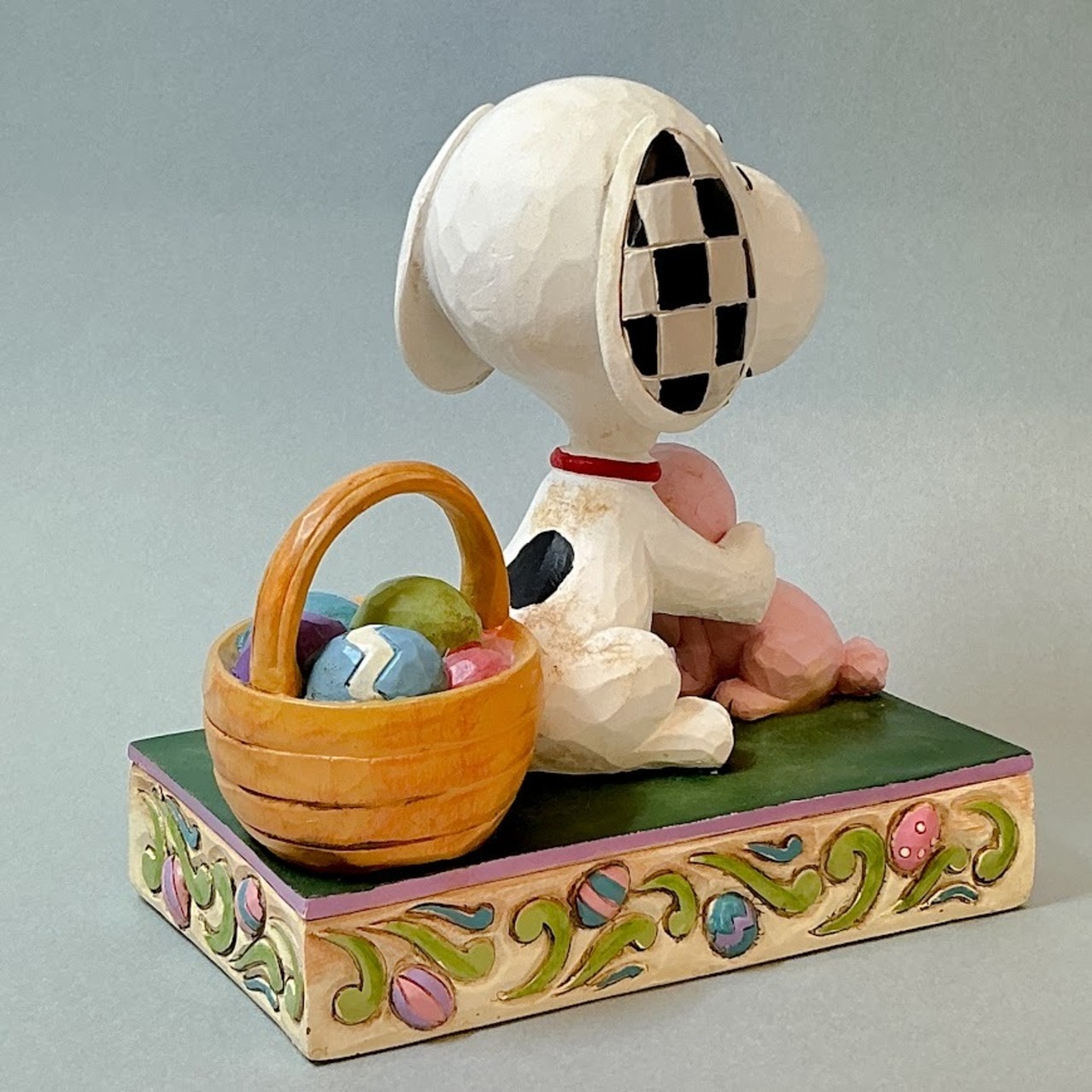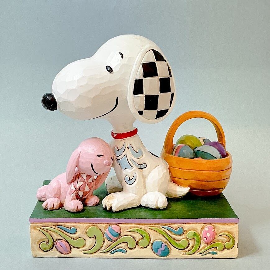 スヌーピーが新しいお友達のバニーのおもちゃをもらって喜んでいる様子が描かれております。