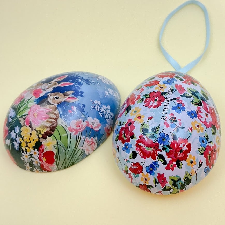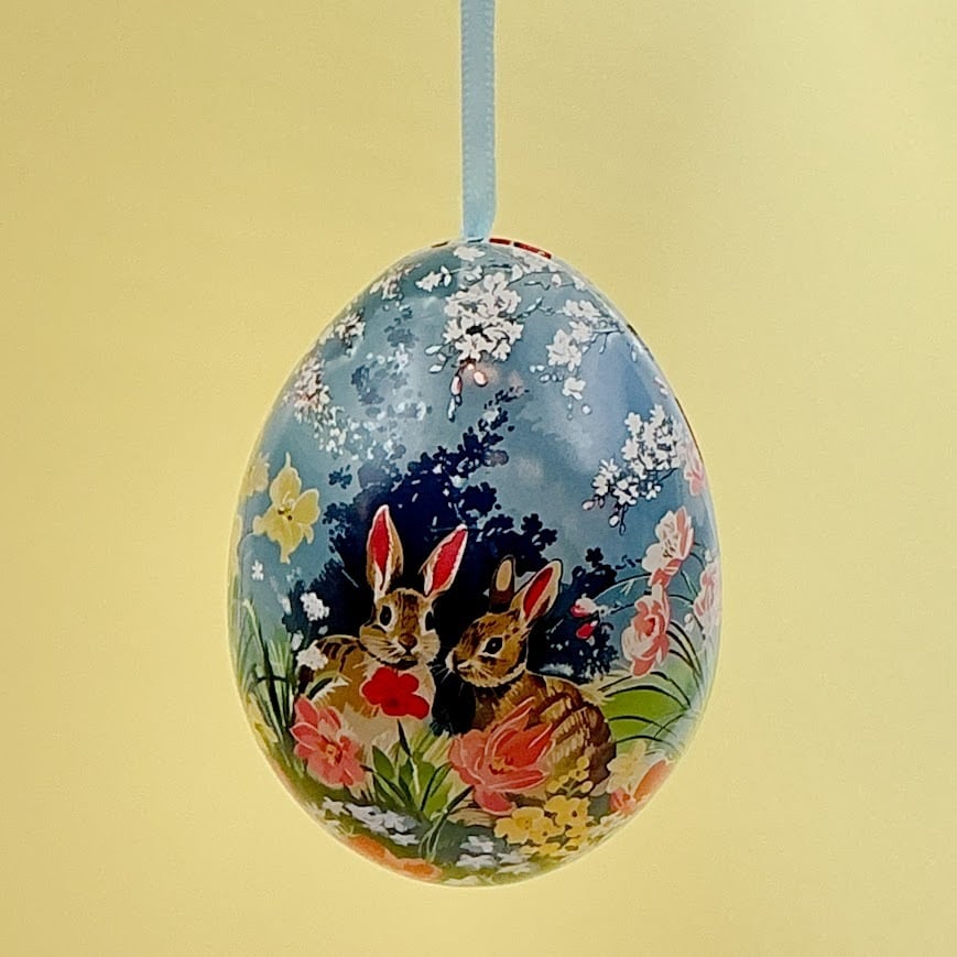 イースターモチーフや春の花々が描かれた、スチール製のエッグオーナメントです。