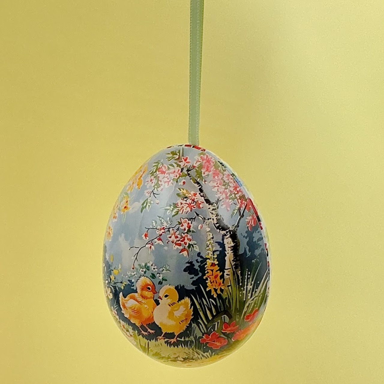 イースターモチーフや春の花々が描かれた、スチール製のエッグオーナメントです。