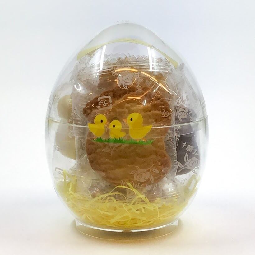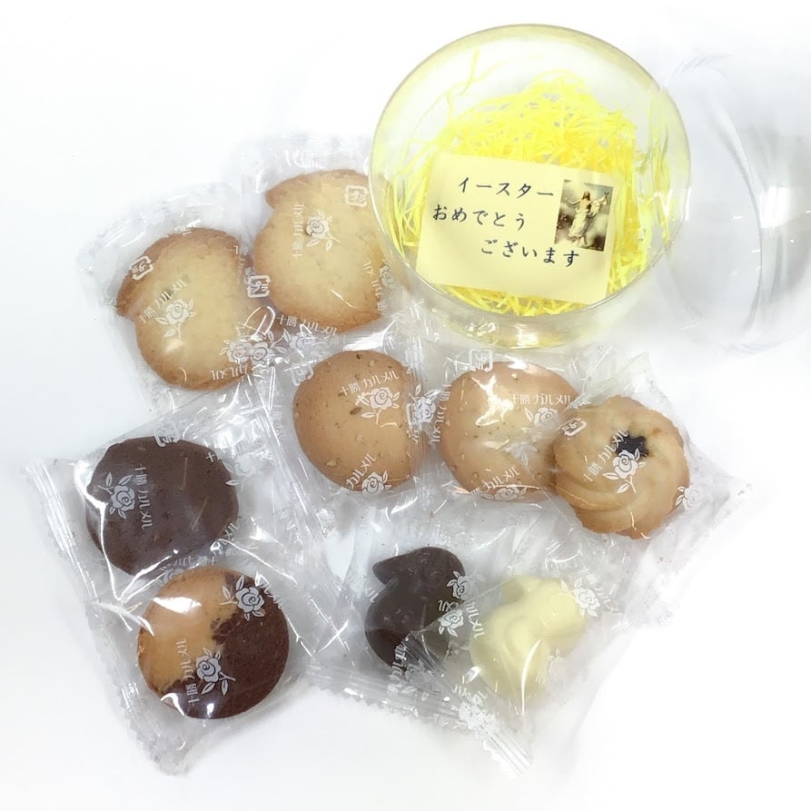 透明なエッグカプセルにクッキーやひよこ型チョコレートを9個詰め合わせたイースター限定のお菓子です。シスターの手作りで一口サイズで食べやすい大きさです。