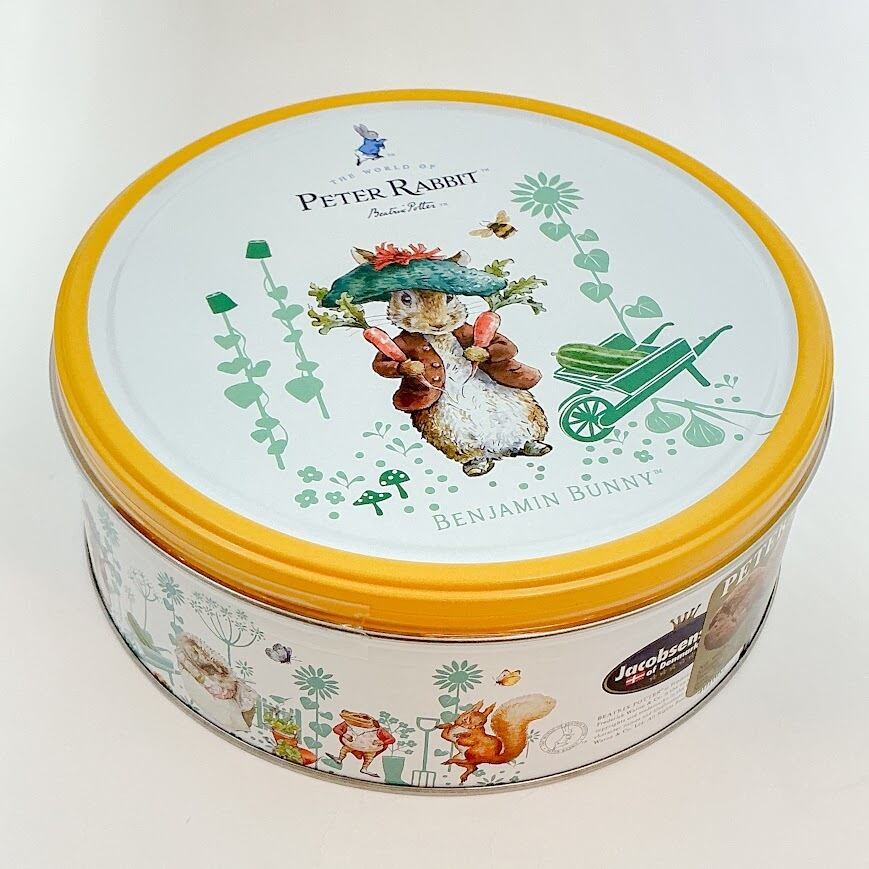 ピーターラビットの世界が描かれたラウンド缶にはチョコチップクッキーが入っています。